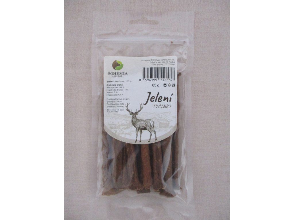 Jelení tyčinky Bohemia Pet Food jsou přírodní masový pamlsek ze 100% jeleního masa. Jelení maso je považováno za velmi kvalitní a dietní zdroj bílkovin a je vhodné pro psy s potravní intolerancí nebo při eliminační dietě.