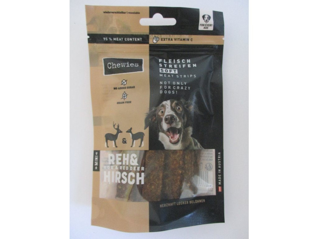 Chewies Fleischstreifen Soft Mini – srnčí a jelení maso 70 g jsou přírodní měkké pamlsky pro psy všech plemen a věkových kategorií. Obsahují 95 % srnčího a jeleního masa, které je šetrně sušené vzduchem, aby si zachovalo přirozenou chuť a cenné živiny. Díky měkké konzistenci se snadno porcuje a je vhodné pro štěňata i starší psy.